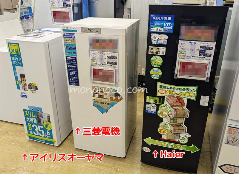 特にメーカー問わずで探していましたが、狭小住宅の我が家に丁度良かったのがアイリスオーヤマの冷凍庫か三菱電機の冷凍庫。