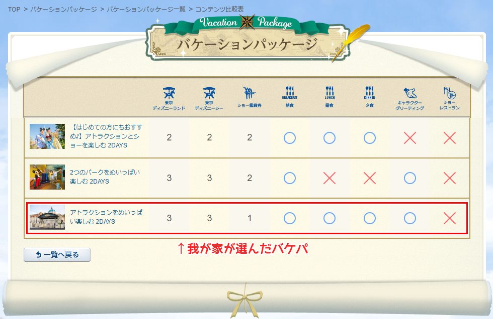 という各自の希望を総合すると、アトラクション利用券が多く、ミッキーに絶対会えて、レストラン予約も可能。と言うことで、今回のバケーションパッケージに決定。