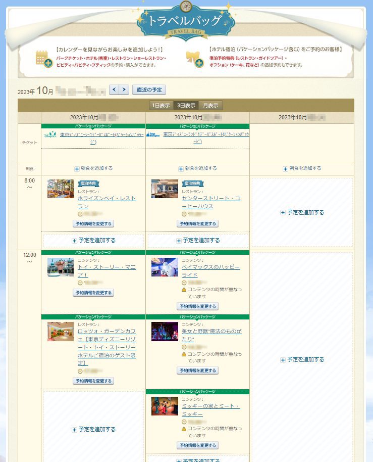 トラベルバックとは、スケジュールを確認しながら、サービスや商品の予約購入、変更もできるディズニー公式のサービスです。ユーザー登録さえすれば誰でも使えるサービスで、バケーションパッケージを予約購入した時点で、諸々自動登録されます。当然変更も可能。