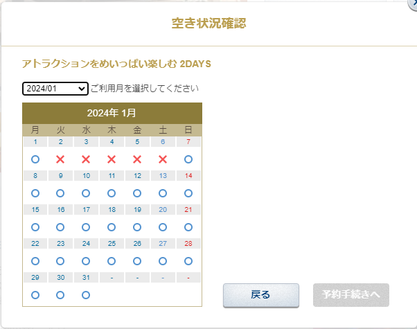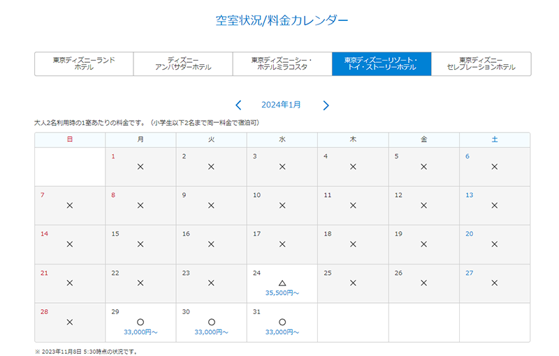 実際 公式HPでの空室状況とバケーションパッケージ(アトラクションをめいっぱい楽しむ2Days)を比較するとこれだけの違いがあります。