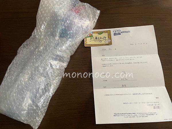 帰宅後、ホテルに購入したおもちゃを忘れたことに気づき、ホテルに連絡した所、ゆうパックの着払いで送って下さいました。我が家の場合¥1080。