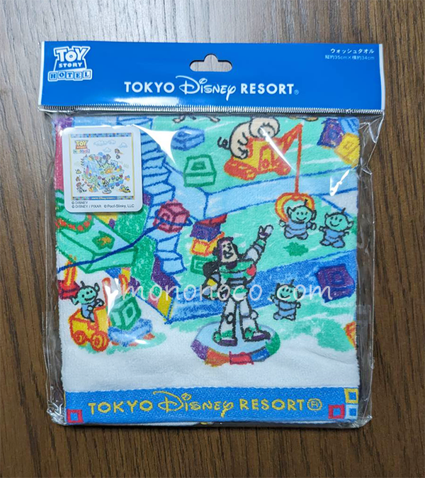 ネットやYoutubeの動画では、ホテル限定アイテムとしてトートバッグやポーチが紹介されていましたが、我が家が行った時点ではホテル限定アイテムはウォッシュタオルの取り扱いしかありませんでした(キャストさんに確認済み)。