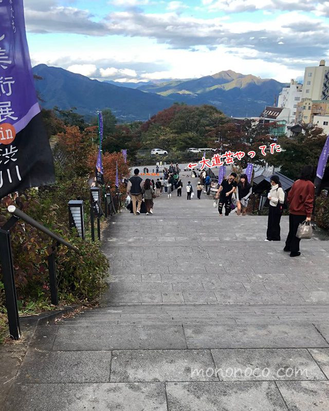子どもたちは写真を撮ったのち、近くでやっていた大道芸にくぎ付け。その間、私とシニアだけ石段を上がってみました。