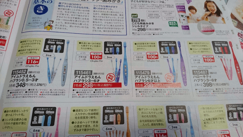 スーパーで見かけないドラえもん歯ブラシ。1本100円なら妥当ですね。