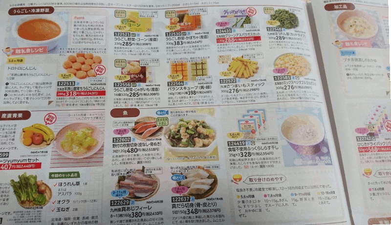 離乳食から冷凍食品、お料理キット(食材・調味料がセットで入っている)、肉・魚・野菜など生鮮食品、トイレットペーパーやおむつ、掃除用具など生活用品など取り扱い商品は幅広く、種類が豊富なのが特徴です。