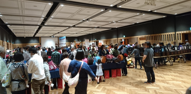 混雑している会場かつランドセルの数も膨大なため、子どもにはかなり負担です。(※休憩用の椅子はそこそこ会場内に用意されています)
