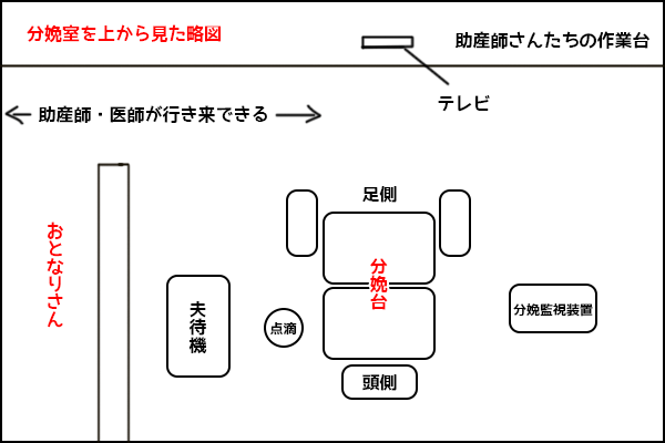 私の産院の分娩室は足元の方が隣室と抜けていて助産師の方が自由に行き来できる構造になっています。