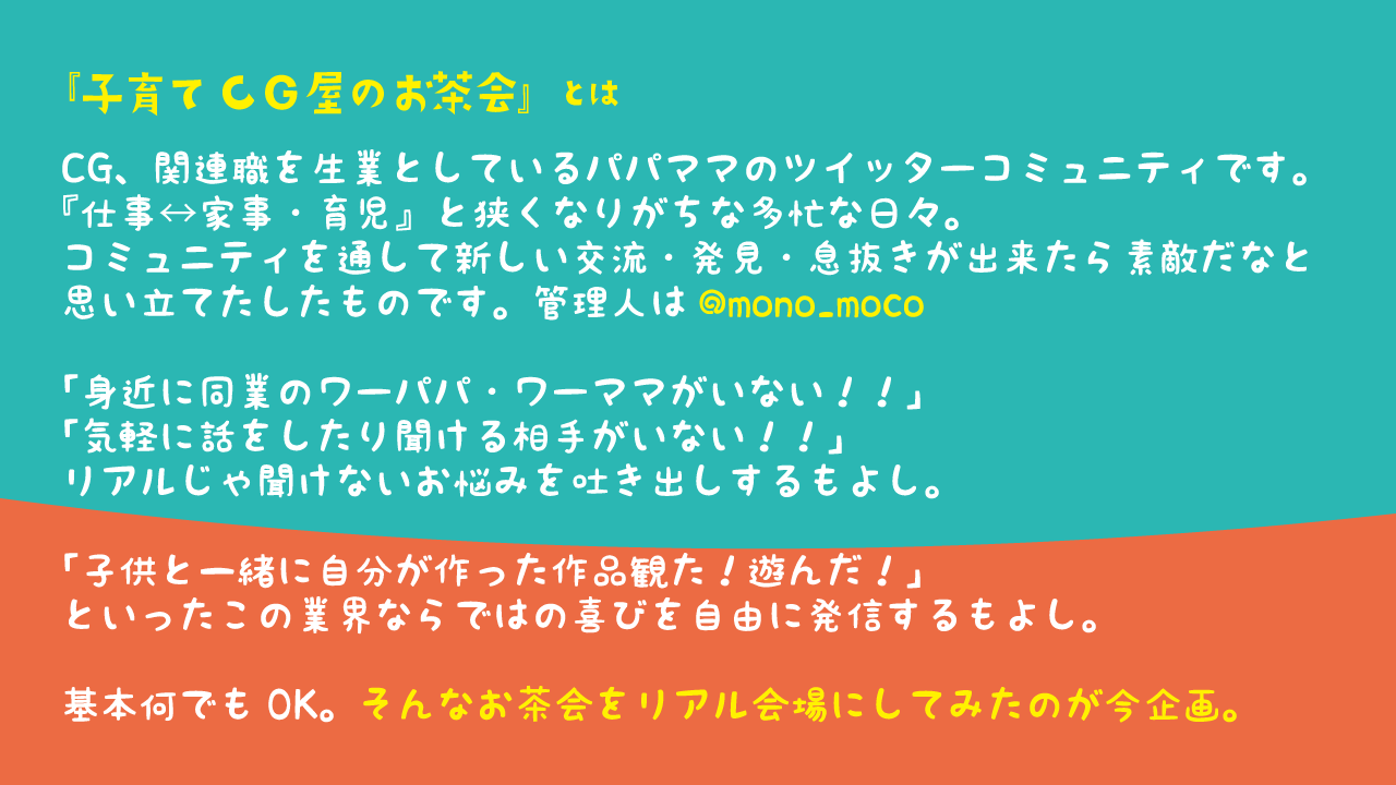 Twitterのコミュニティ『子育てCG屋お茶会』をリアル開催しようぜ!