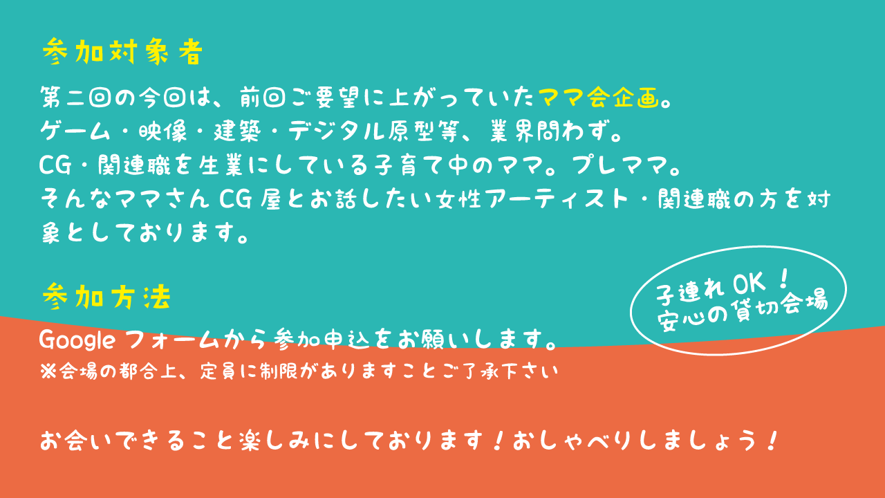 ゲーム/映像/建築/デジタル原型等業界問わず。 (2D/3D)CG制作及びVFX、PM等管理関連職、他教員・関連書籍編集等、生業にしている子育て中の方、またそんな人達に相談したい方。