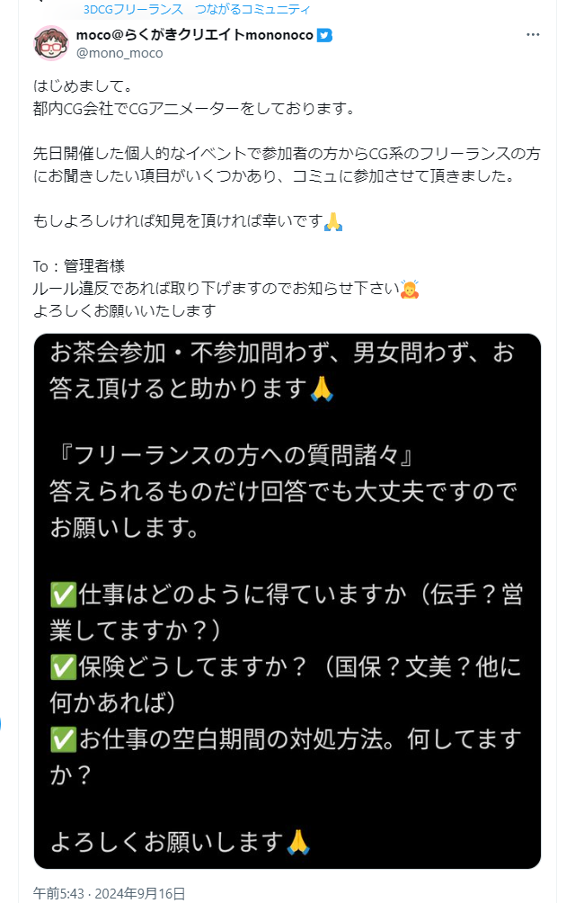 今回お茶会参加者ではフリーランスの方の母数が少なかったため、Buncho氏(@BunchoCG)が立てたコミュニティ「3DCGフリーランス つながるコミュニティ」にもご協力頂き回答を抜粋、まとめました。とてもたくさんの回答を頂きました!皆さまご協力ありがとうございます✨